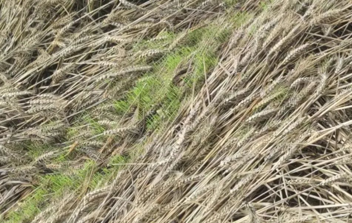 倒伏在地里的小麥來不及收割,開始發(fā)芽