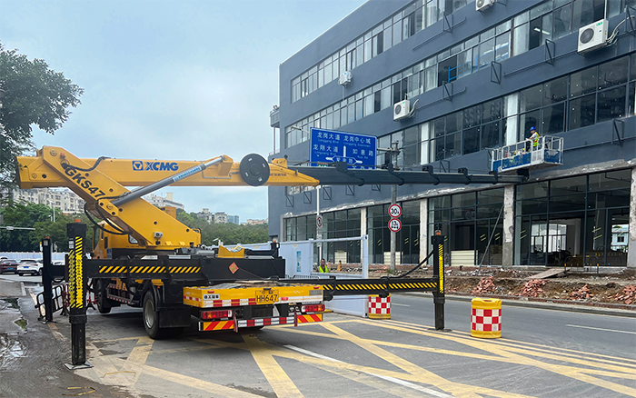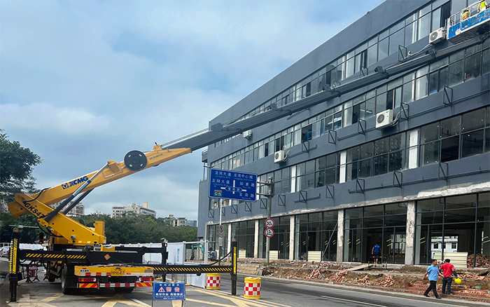 本次施工恰逢傍晚高峰期,時間緊、任務重,且水電路管道安裝需要長時間、高精準的持續(xù)性作業(yè),對高空車性能要求較高。為避免占道施工阻礙交通,徐工GKS47高空作業(yè)車在街道對面的臨時停車區(qū)域快速展車,作業(yè)斗搭載3名施工人員和管路材料平穩(wěn)伸出20余米,橫跨整條街道,直抵商鋪外立面的作業(yè)地點,憑借獨有的高精度比例閥驅(qū)動控制技術(shù),實現(xiàn)微小流量的精準控制,使工作平臺毫米級的位置調(diào)節(jié),便于工作平臺位置精調(diào);柔性制動讓操作更加舒適,能夠精準識別操作員的操作意圖,制動體驗平穩(wěn)、低沖擊、小晃動,以“微動性、安全性、高效率、大跨距”產(chǎn)品特點完美應對此次施工任務。