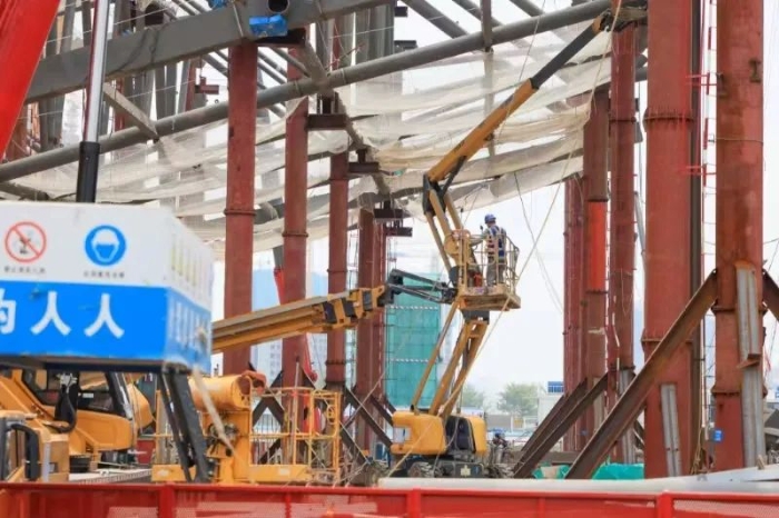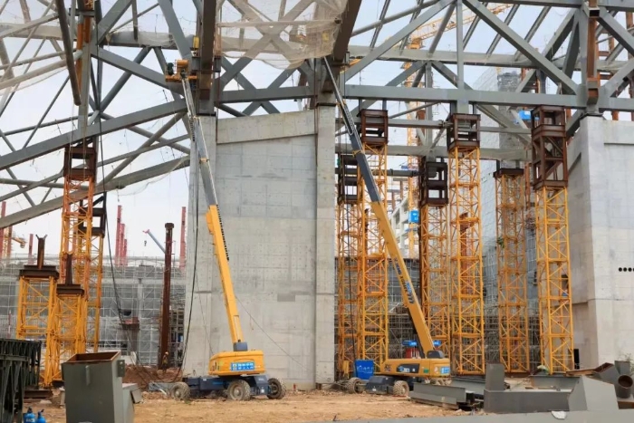 忙碌的工地上,隨處可見“徐工金”辛勞的身影。此次參與施工的有四十余臺徐工高空作業(yè)平臺,高度從22米到40米不等,主要負(fù)責(zé)場館鋼結(jié)構(gòu)的安裝工作。