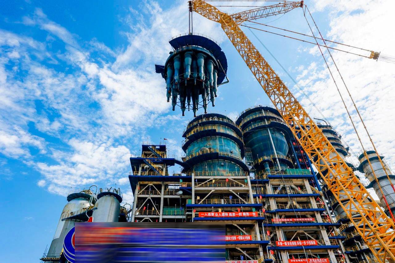 近日,XLC30000履帶起重機在我國東南地區(qū)某大型石化項目基地順利完成總重達648.6噸的沉降器舊旋分系統(tǒng)吊裝工作。