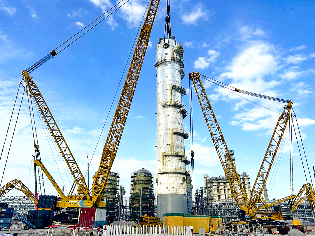 吊裝當(dāng)日,經(jīng)過遞送、提升、轉(zhuǎn)桿、下降等精準(zhǔn)操作,塔器穩(wěn)穩(wěn)就位,全程僅用一個(gè)小時(shí)。此外,XGC88000還在十天內(nèi)完成了急冷水塔和急冷油塔的吊裝任務(wù),創(chuàng)造了新的奇跡,展示了XGC88000的王者風(fēng)范。