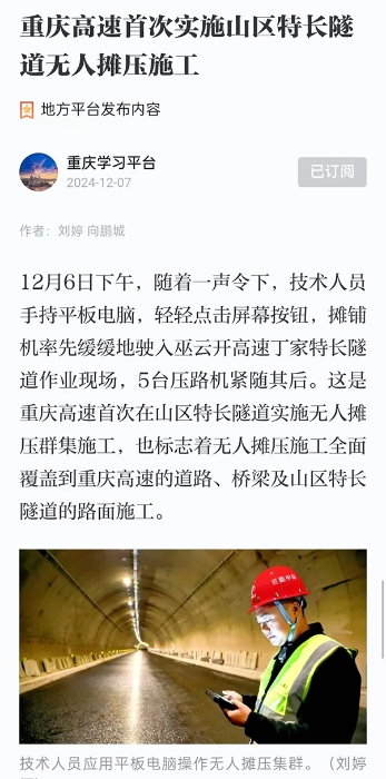 近日,徐工智慧施工技術(shù)成套道路裝備在重慶交通建設(shè)領(lǐng)域再次展現(xiàn)卓越實(shí)力,在巫云開(kāi)高速公路項(xiàng)目丁家特長(zhǎng)隧道施工中,成功突破山區(qū)特長(zhǎng)隧道無(wú)衛(wèi)星信號(hào)等技術(shù)難題,順利實(shí)施了無(wú)人攤壓群集施工,開(kāi)創(chuàng)了重慶隧道內(nèi)智慧施工的先河。