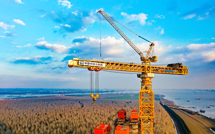 在張靖皋長(zhǎng)江大橋南航道橋北主塔施工現(xiàn)場(chǎng),徐工XGT15000-600S超大型塔機(jī)如鋼鐵巨人伸展手臂,將重達(dá)數(shù)百噸的鋼塔節(jié)段緩緩吊起,“搭積木”般穩(wěn)穩(wěn)放落在塔柱上。