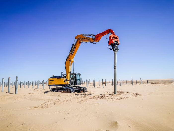 與以往常規(guī)項目不同,此次徐工挖掘機主要擔任光伏樁的鋪設工作,通過改裝振動錘和引孔機等多功能屬具,有效滿足現(xiàn)場多元化施工需求。