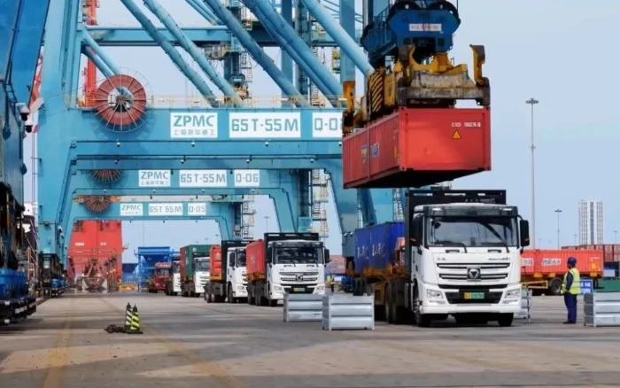 巨輪泊岸,裝船機(jī)臂展如虹,一輛輛身披晨光的徐工新能源重卡,在碼頭前沿與堆場(chǎng)間穿梭不息,織就一幅物流奔騰、經(jīng)濟(jì)躍動(dòng)的壯闊圖景。