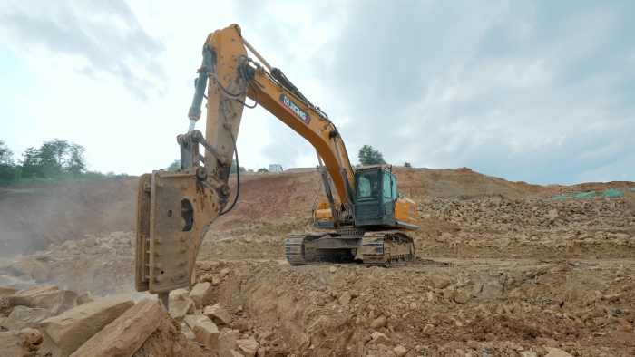 該設(shè)備搭載的低速大扭矩發(fā)動(dòng)機(jī)與大排量主泵協(xié)同發(fā)力,15100J的超大沖擊力輕松解體圍巖巨石,破碎后的骨料直接用于站區(qū)圍擋澆筑填充,實(shí)現(xiàn)資源閉環(huán)利用。