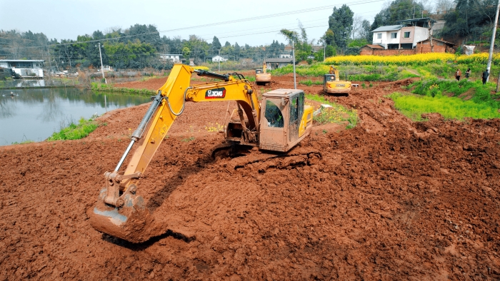 洪雅向東90公里,是仁壽縣,作為四川省產(chǎn)糧大縣,仁壽曾因田塊細(xì)碎導(dǎo)致機械化率不足。在5000畝的高標(biāo)準(zhǔn)農(nóng)田建設(shè)中,項目方集結(jié)18臺徐工挖掘機,以“日均30多畝”的速度搶抓工期。