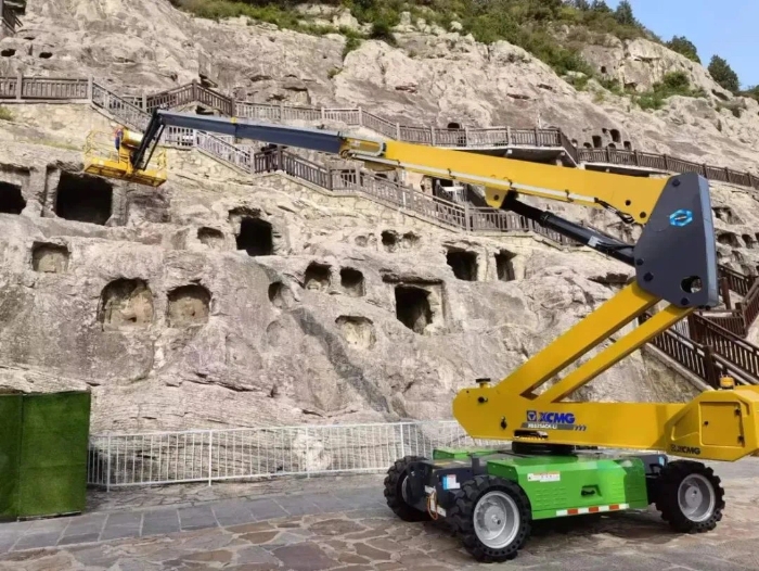 時間回溯到2021年,由于遭受多場暴雨侵襲,龍門石窟部分洞窟內(nèi)滲漏水嚴(yán)重甚至出現(xiàn)積水,部分山體表面巖石脫落、松動,嚴(yán)重威脅文物安全,急需得到有效治理。龍門石窟研究院隨即開展了為期1年多的“龍門石窟蓮花洞至石牛溪區(qū)域保養(yǎng)維護(hù)項目”。徐工XGS25ACK-Li直臂式高空作業(yè)平臺作為“得力助手”,深度參與各項保護(hù)修復(fù)工作。