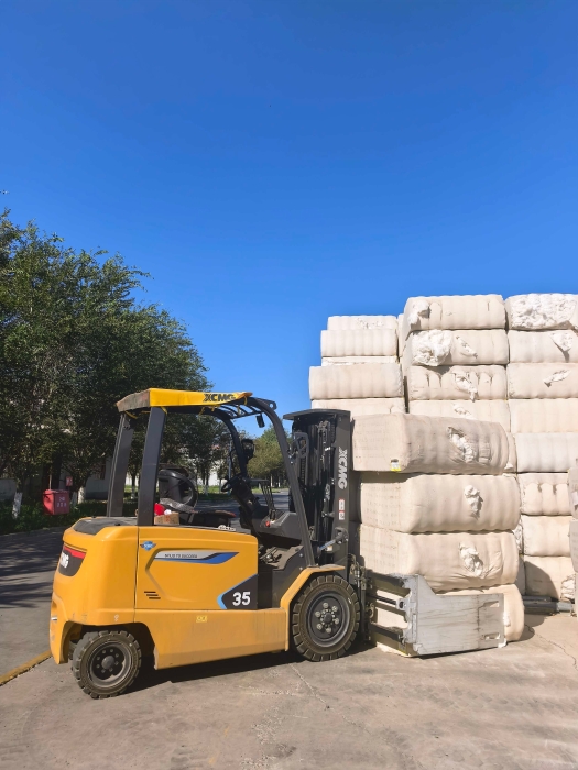 棉花廠的作業(yè)場景復雜,原材料搬運與成品轉(zhuǎn)運任務繁重。以往,傳統(tǒng)搬運設備在效率、環(huán)保等方面存在諸多局限。而此次進駐的徐工鯤鵬電動平衡重叉車,擁有強大的性能優(yōu)勢,堪稱棉花廠物料搬運的 “理想搭檔”。它采用鉛鋰同平臺設計,能滿足不同場景、不同客戶多樣化的能源需求。無論是在原材料堆放區(qū)搬運沉重的棉花包,還是在成品倉庫轉(zhuǎn)運打包好的棉產(chǎn)品,都能輕松應對。其驅(qū)動系統(tǒng)、起升系統(tǒng)均采用免維護全交流大功率電機,前輪電機獨立控制,動力強勁,大大提升了搬運效率。