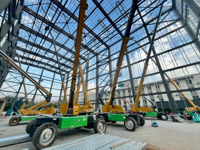 多臺設(shè)備組成的"綠色戰(zhàn)隊(duì)"展現(xiàn)出強(qiáng)大的協(xié)同作業(yè)能力,其靈活的轉(zhuǎn)向模式和強(qiáng)大的通過性在密集的鋼構(gòu)件中穿梭自如,大幅提升了焊接安裝的效率,為這項(xiàng)重點(diǎn)工程的順利推進(jìn)提供了強(qiáng)有力的高空保障。