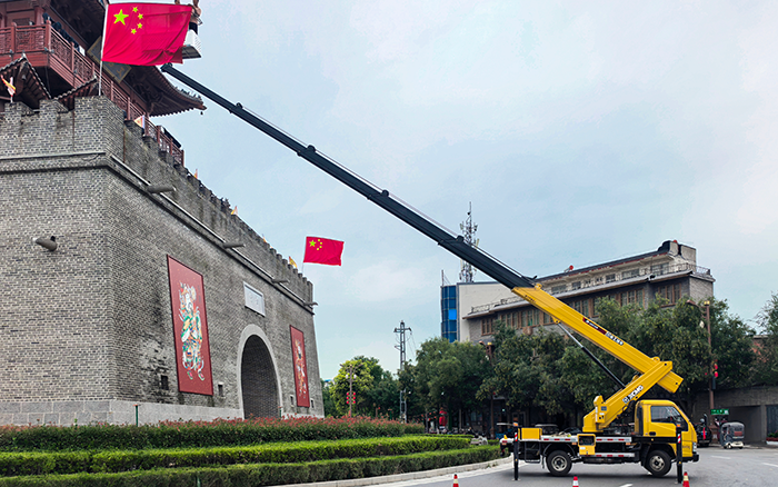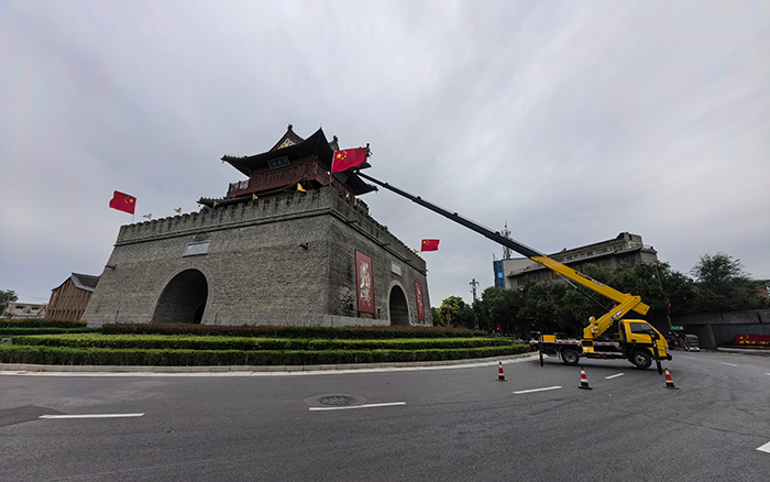 文昌閣前,一抹抹 “中國紅” 悄然升起。徐工 M 系列 GKS32 高空作業(yè)車伸展長臂,穩(wěn)穩(wěn)將施工人員送達(dá)高空作業(yè)點(diǎn)。最大作業(yè)高度32 米,精準(zhǔn)覆蓋建筑立面,轉(zhuǎn)臺 360° 連續(xù)回轉(zhuǎn)間,國旗已平穩(wěn)就位。