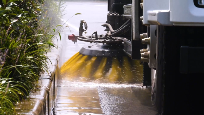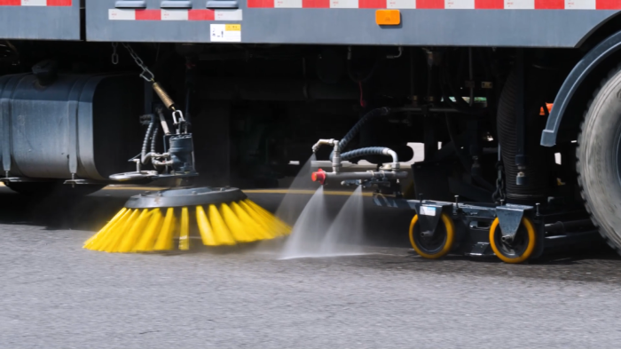 產(chǎn)業(yè)區(qū)周邊道路:運輸車輛頻繁出入,易產(chǎn)生碎屑、油污。洗掃車搭載的高壓水槍與V型噴桿,可對路面進行深度沖洗,油污去除率超95%,避免二次污染。
