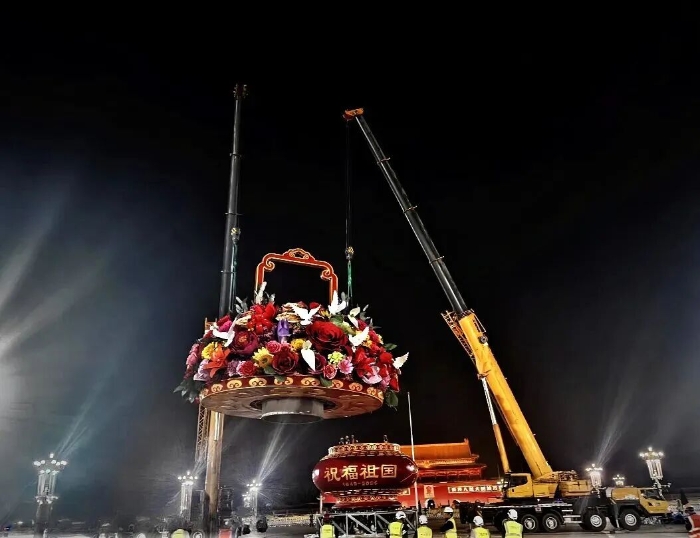 這已是徐工連續(xù)第十五年參與天安門國慶花籃吊裝任務(wù)。9月22日凌晨,兩臺徐工200噸級汽車起重機(jī)協(xié)同作業(yè),將重達(dá)60噸的籃盤平穩(wěn)起吊,與16米高的籃體實(shí)現(xiàn)毫米級精準(zhǔn)對接。