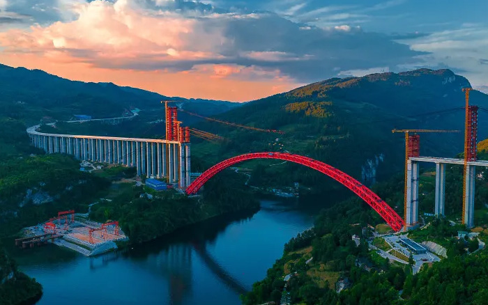 烏江特大橋全長1834米,主橋為504米上承式鋼管混凝土拱橋,是德余高速公路的重要控制性工程,也是世界最大跨徑上承式鋼管混凝土拱橋。大橋采用的拱、柱、梁全固結無支座整體式受力體系為國內首創(chuàng),施工極具難度,代表了目前同類型橋梁建造的世界頂級水平。