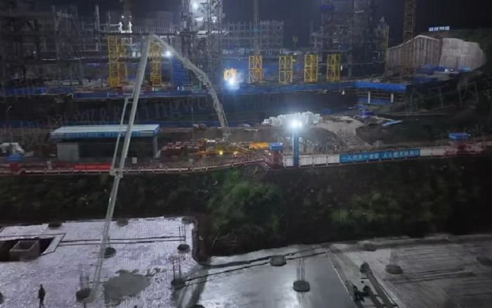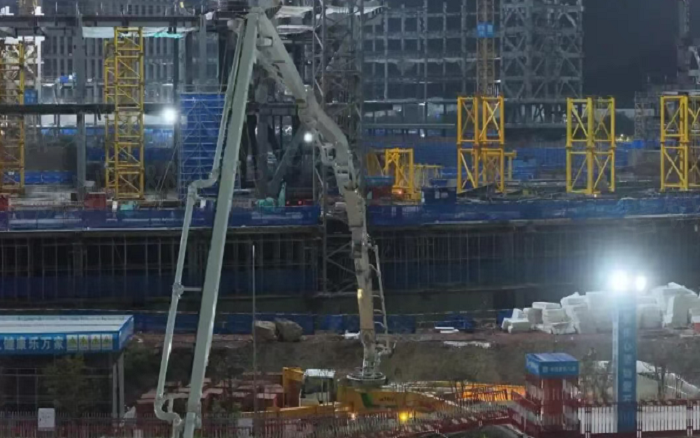 凌晨三點的重慶兩江新區(qū),徐工72米泵車展臂高空,20輛新能源攪拌車穿梭往來—這不是科幻電影場景,而是徐工混凝土成套化裝備助建重慶賽力斯全球汽車公園的火熱夜戰(zhàn)場面。