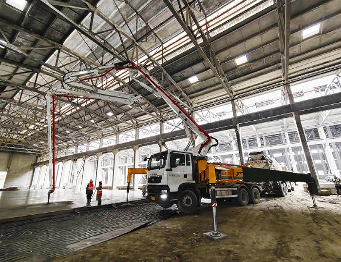 HB43V泵車(chē)搭載五節(jié)“RZ”型折疊布料桿,370°靈活旋轉(zhuǎn)無(wú)施工死角,憑借高效泵送能力適配大面積地坪連續(xù)澆筑需求,精準(zhǔn)滿(mǎn)足C30混凝土強(qiáng)度與平整度標(biāo)準(zhǔn)。