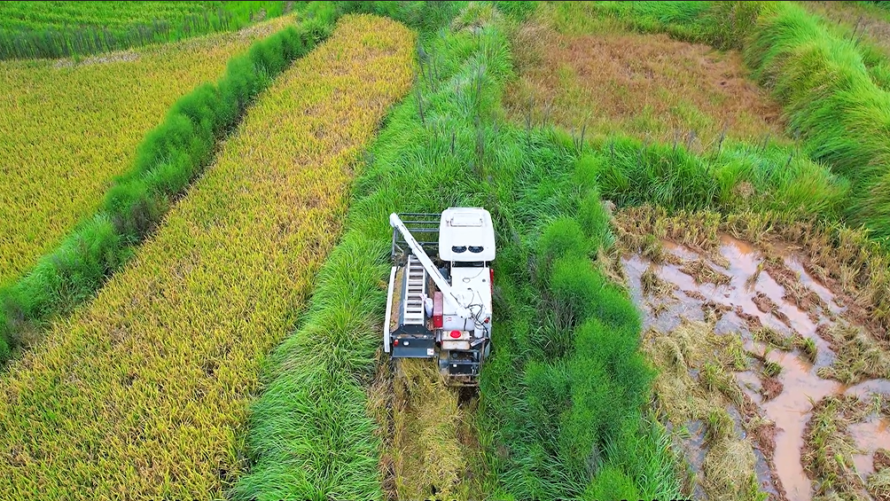 這車特別適合我們丘陵地區(qū),爬坡上坎完全不在話下,因為這臺機器重心設(shè)計合理,離地間隙也高,防陷能力強,爛泥田通過性也很好。割臺設(shè)計得短,下坡也不容易吃土,用著很踏實。