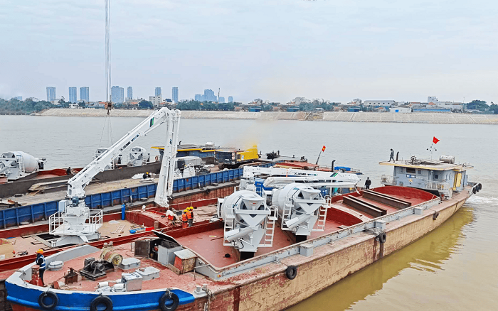 近日,專為水上施工定制的兩臺徐工船載式布料機與八臺船載式攪拌罐裝車順利集結,正式發(fā)往越南,將投入到當?shù)刂攸c跨河大橋項目建設中。