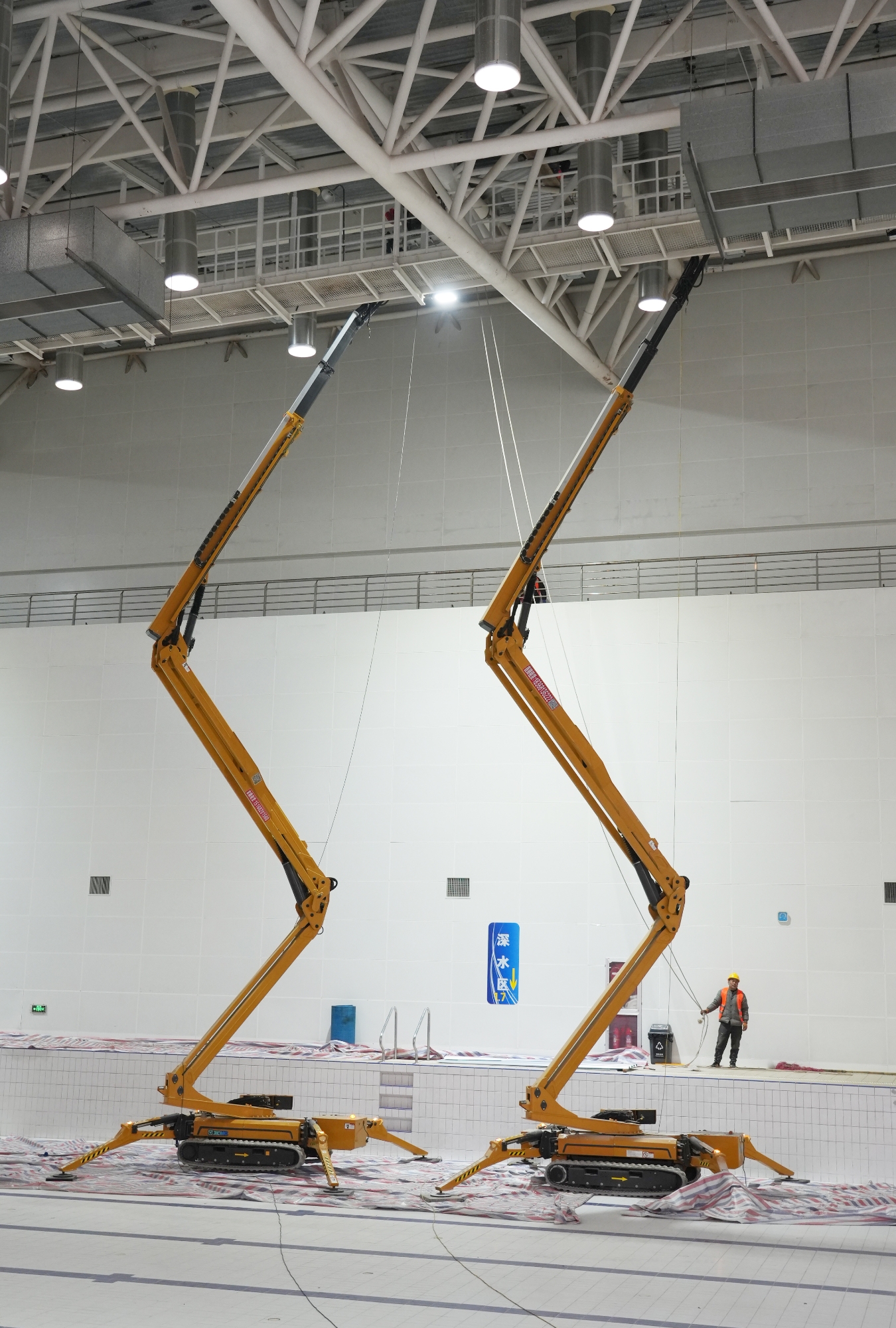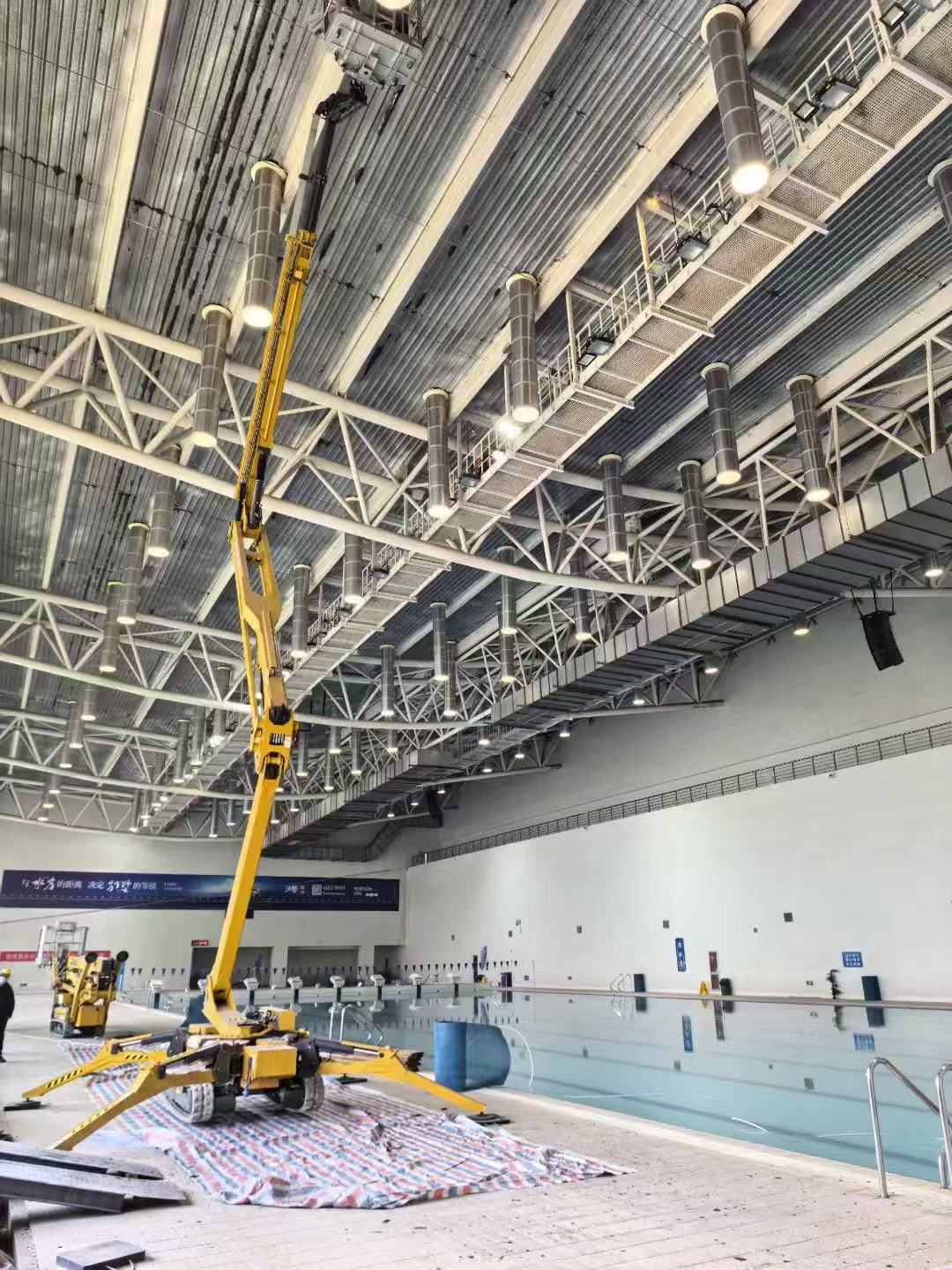 該設(shè)備采用履帶式底盤,自重4.6噸,接地比壓小,完美適配泳池低承重及地面保護(hù)作業(yè);車寬僅0.99m,可靈活穿梭狹窄通道,通行無阻;工作幅度可達(dá)15m,無需頻繁起降,省時(shí)高效,到場(chǎng)即可開工,此次施工僅配置3臺(tái)設(shè)備和10名操作人員,便能高效推進(jìn)任務(wù),在保障工程質(zhì)量的同時(shí)顯著縮短了工期,實(shí)現(xiàn)了效率與成本的雙重優(yōu)化。